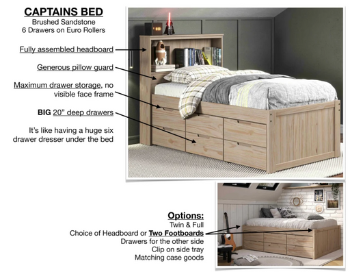 InnovationsLow stock, call for availabilityThe Captains bed headboard is fully assembled. You get a generous pillow stop. The six individual under bed drawers offer maximum storage as there ...