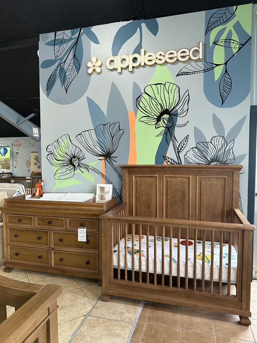 AppleseedThis item can be ordered, please contact us for estimated lead time4 piece set includes: crib, double dresser, changing tray, changing pad Solid and sturdy panels shape the striking Rowan Crib in a rustic wood fin...