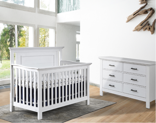 PaliLow stock, call for availability4 piece set includes: vintage white como flattop crib, como double dresser, changing tray, changing pad On display in store