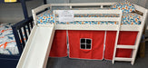 The Canal House White Mini Loft with Slide is Constructed of Solid Pine Wood, MDF and Pine Veneers. The wood is Plantation grown, renewable and well managed forest harvested wood. The Natural wood grain, color variation and wood knots is the result of the natural beauty of the wood. The slide is 53"L. The overall bed dimensions are 46H x 96W x 81D. Imported. Includes Bed frame, slats, ladder, slide