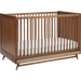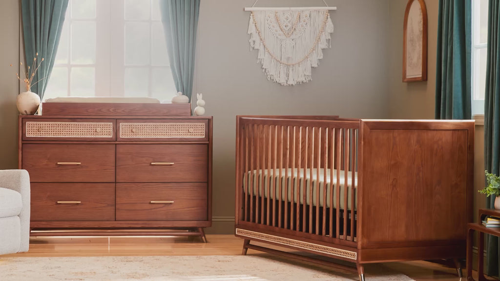 The Kindred Everheart 4-in-1 Convertible Crib celebrates the appeal of mid-century modern styling featuring clean, straight lines, elegantly sculpted legs, and natural rattan detailing along the base. The timeless design is highlighted with special details like round spindles and brass-finished steel accents. Crafted with walnut-stained solid ash wood to complement the décor of any nursery.